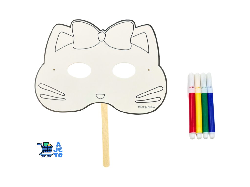 Balení obsahuje papírovou masku na dřevěné tyčce a čtyři barevné fixy