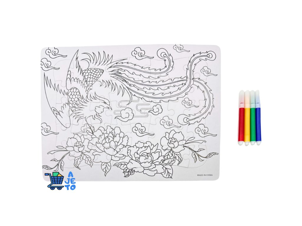 Balení obsahuje puzzle k vymalování a sadu čtyř barevných fixů