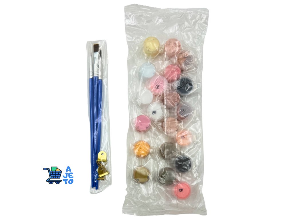 Balení obsahuje plátno s předtištěným motivem podle čísel, sadu akrylových barev, tři štětce a hřebíky s matky