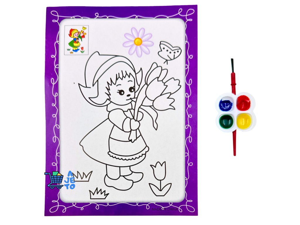 Balení obsahuje oboustranný obrázek k vymalování, vodovky a štetec